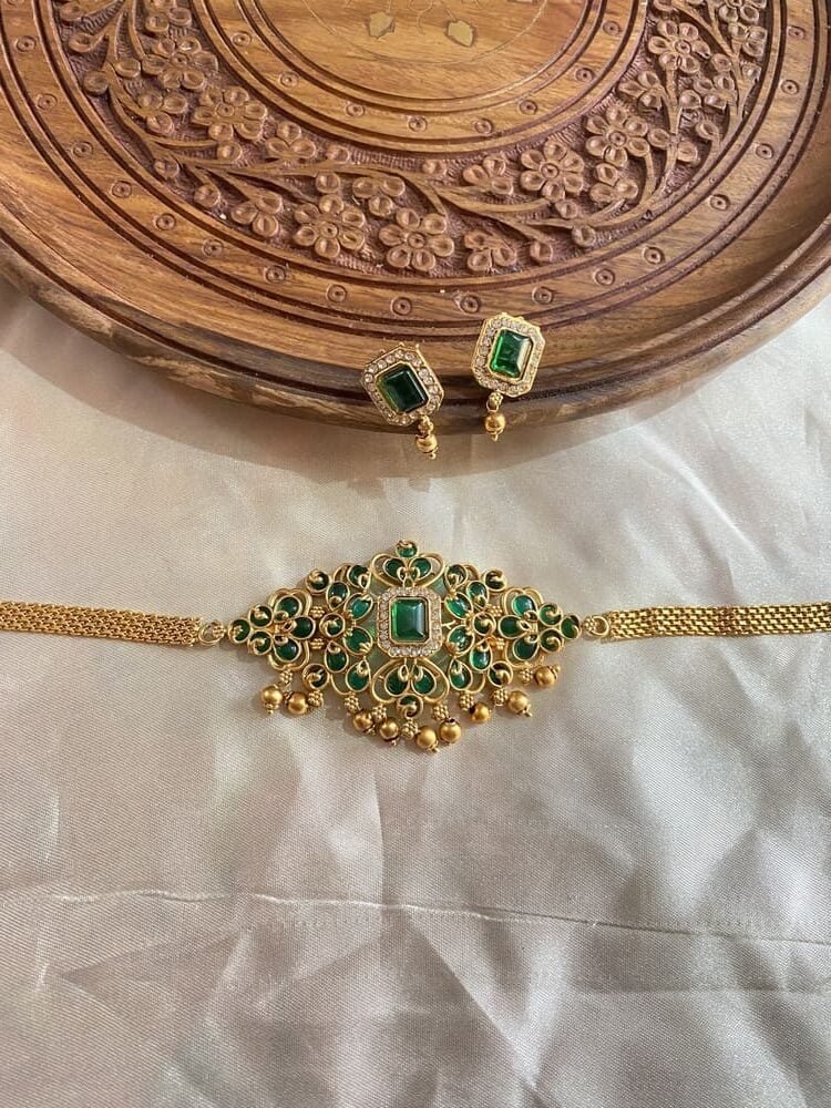 Matte finished the chic neck hugging choker set embelished with the stones.This piece of beauty comes with a pair of cute earrings